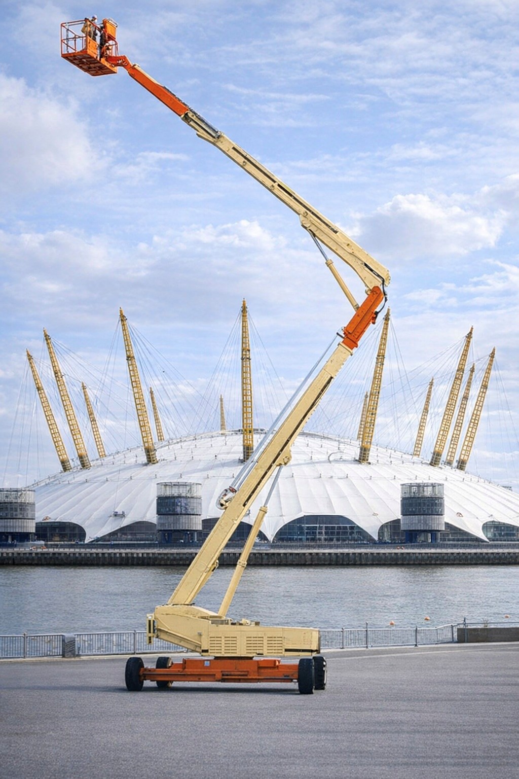 Arriving through Liverpool docks directly from the JLG factory in America, the sheer size and presence of the platform made it impossible to transport quietly. For its time its size was exceptional so the journey from port to site required a full logistics escort, drawing attention wherever it travelled. At a time when the Dome symbolised Britain’s confidence stepping into a new millennium, this machine would play a crucial role behind the scenes enabling safe access at unprecedented heights for a self-propelled boom platform.